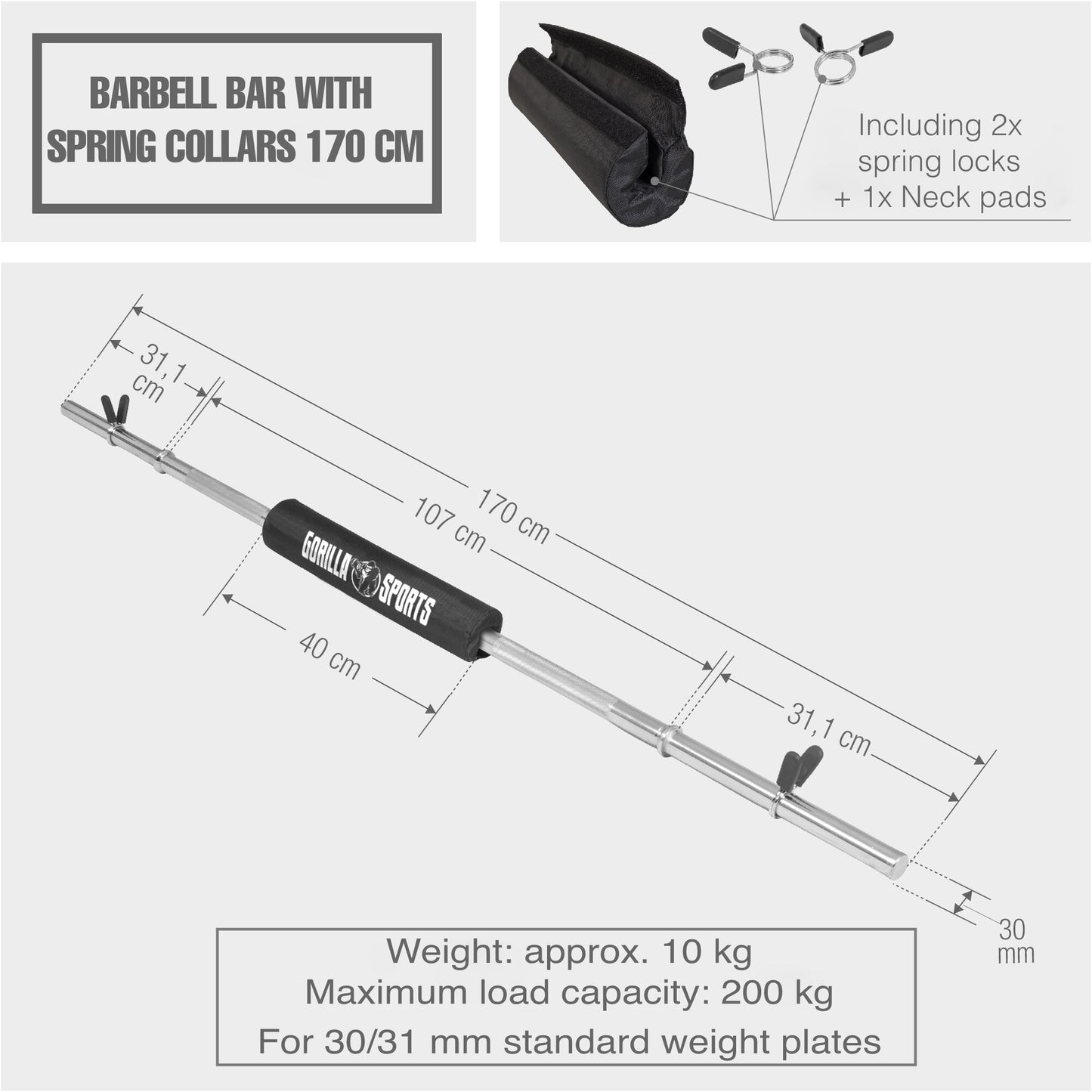 Barbell Bar 170 cm (5.5 ft) with Neck Pad and Spring Collars