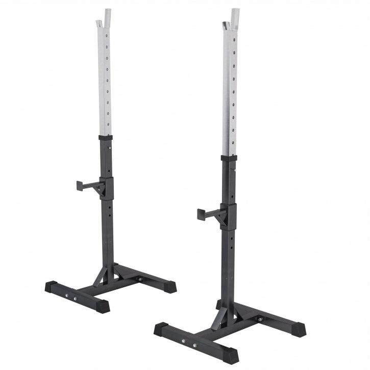 Are you looking for a comfortable rack for your barbell to perform effective exercises without a training partner? The practical barbell rack in black is perfect for your plans. It consists of two columns that can be set up separately. Solid feet in a double-T shape prevent the construction from tipping over when loaded from the side. The upper support for the barbell can be adjusted to a height of between 105 and 172 cm (measured at the top edge of the support) using a simple mechanism. A second support is provided for exercises with a bench. If you don't need the barbell rack, you can store it in a corner to save space or use it as attractive storage for your barbell.