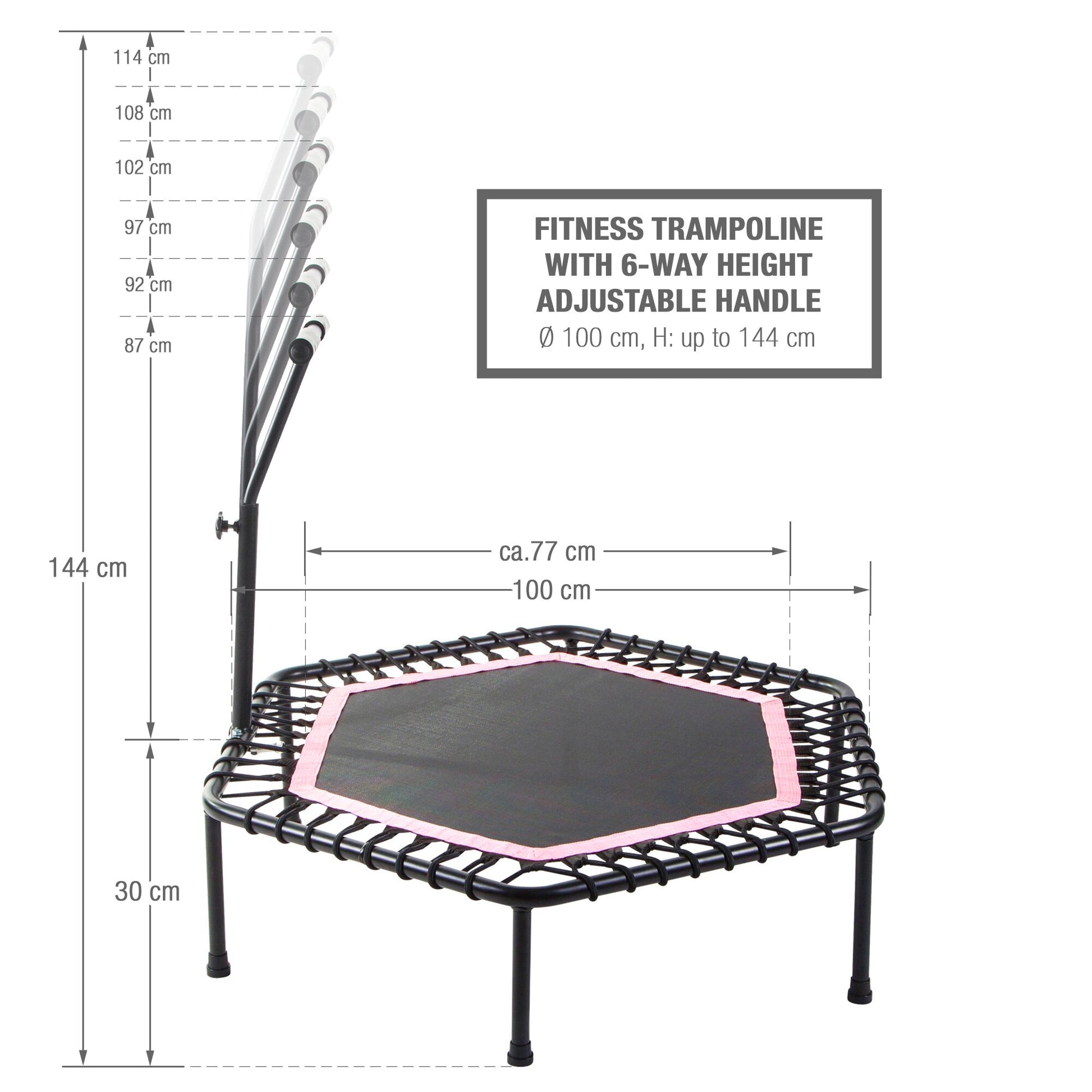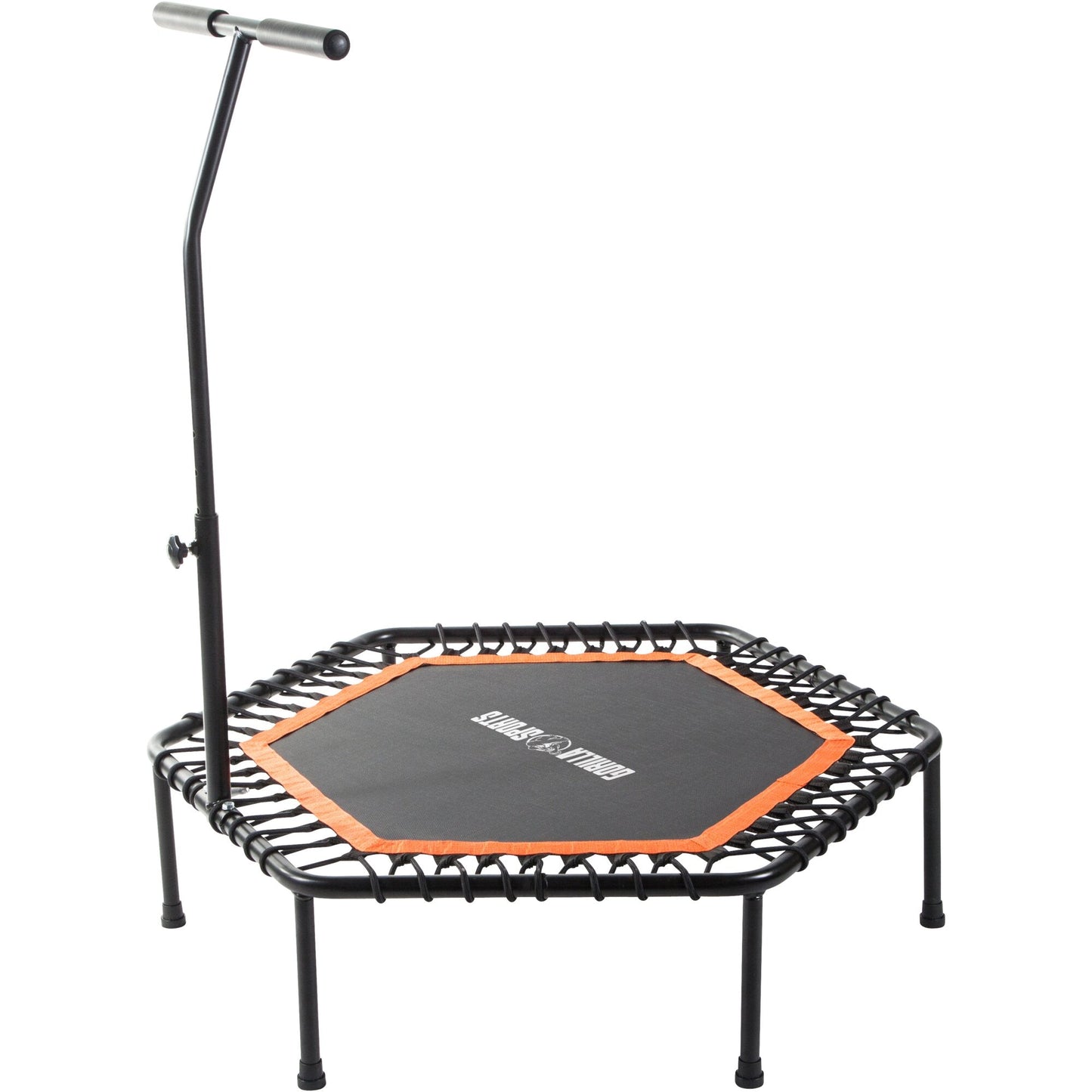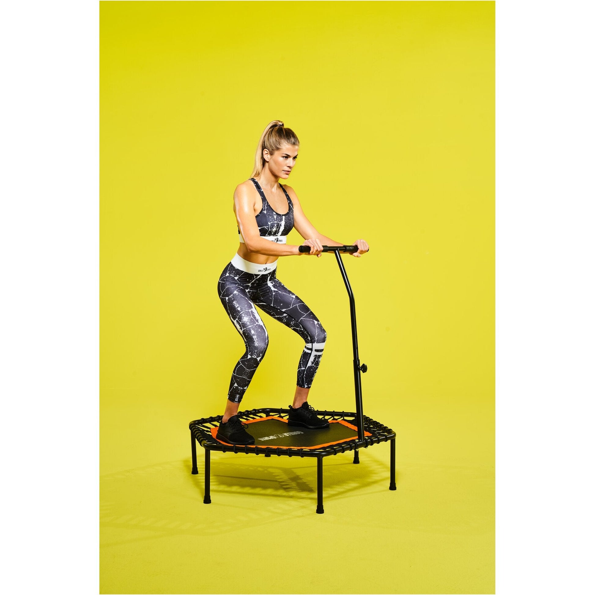 With the high-quality Fitness Trampoline from Gorilla Sports, you can literally jump on the jumping fitness trend. It's a lot of fun with your favourite music while you increase your fitness and endurance, improve your jumping power and stability and train your whole body. The edging of the hexagonal jumping mat in orange, blue or pink provides visual orientation and harmonises with the black of the trampoline.