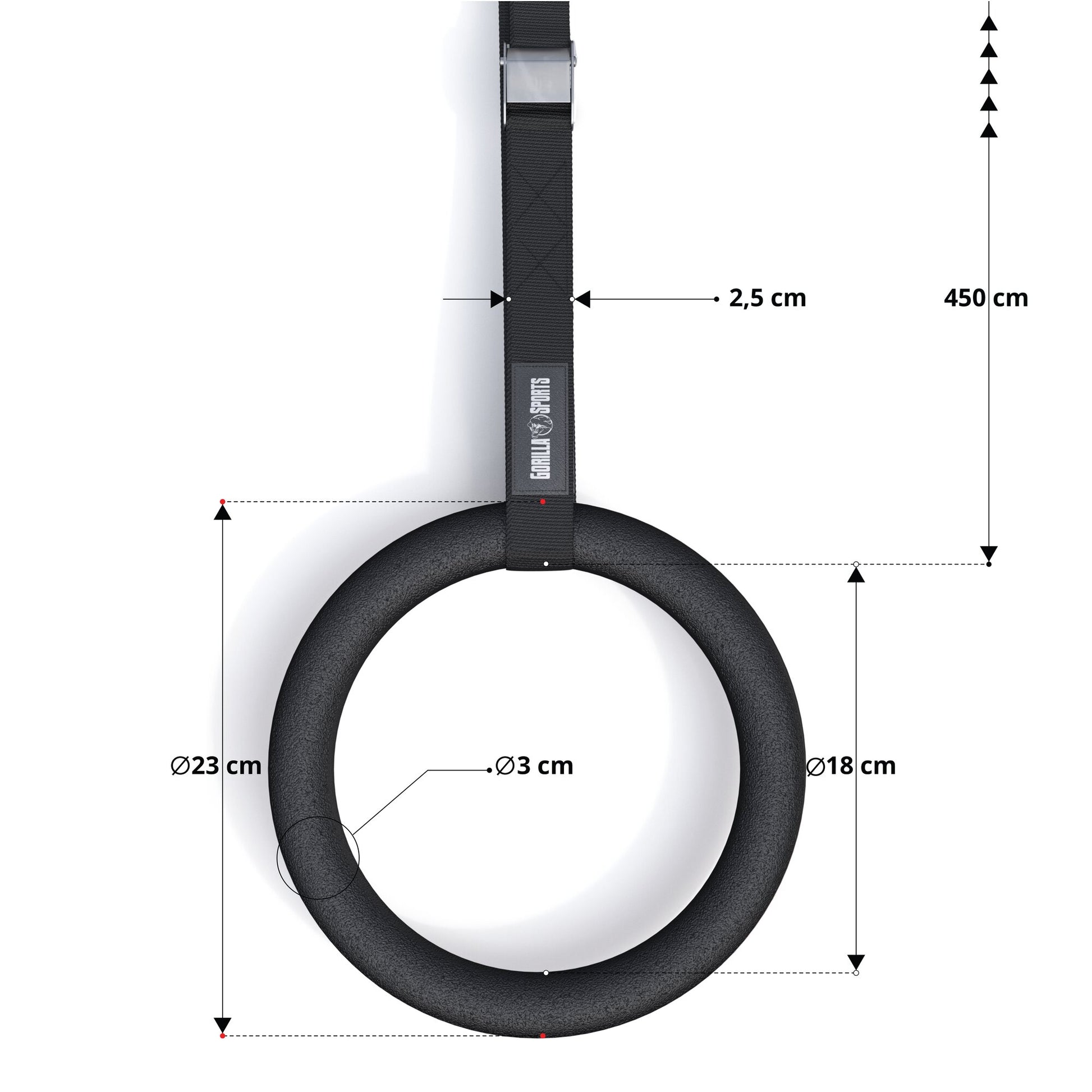 The gymnastic rings are designed with a diameter of 23 centimetres and come with two sturdy straps featuring quick-release fasteners. The straps are incredibly durable, tear-proof, and can support up to 200 kilograms, enabling a wide range of exercises. With their simple setup, you can get started straight away.