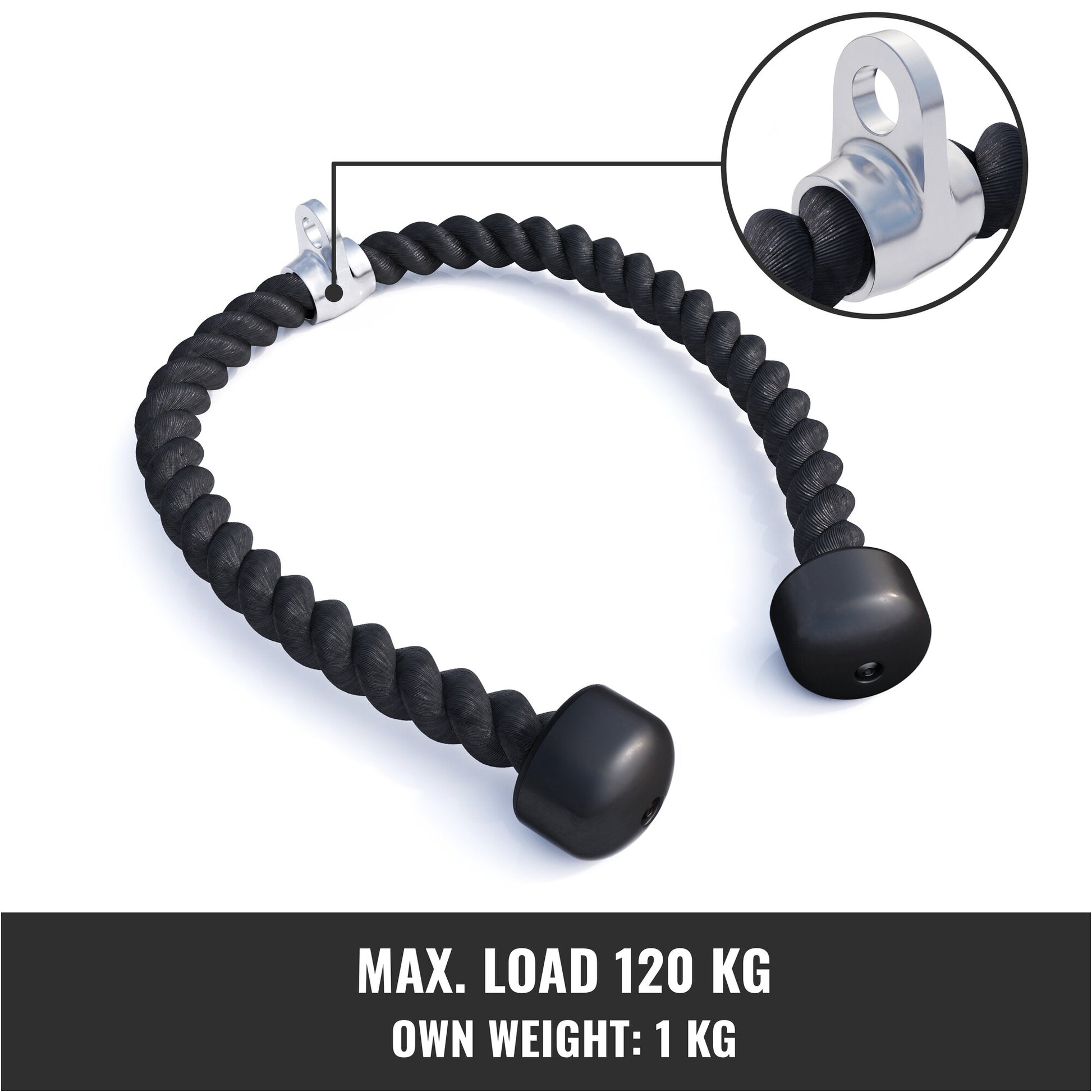 This rope is manufactured to the highest studio quality and is therefore an ideal addition to your own gym at home. Thanks to the extremely flexible shape of the rope, you can train specific muscle groups and muscle areas in a variable and targeted manner. The advantage of being able to vary the grip width and angle dynamically makes a rigid bar look ancient in comparison. And it's not just the triceps that you can work up a sweat with - if you approach the rope at a station from below, you can also train the biceps optimally. You can also train your back and chest without any restrictions. The sturdy chrome joint also contributes significantly to the versatility of use.