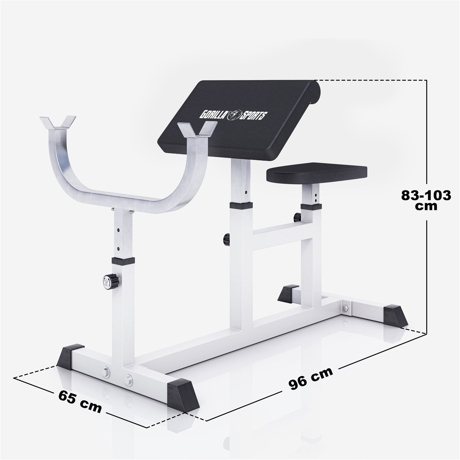 The Preacher Curl Bench White from Gorilla Sports is used for isolated training and strengthening of the biceps and can also be used for strength exercises to strengthen the triceps.