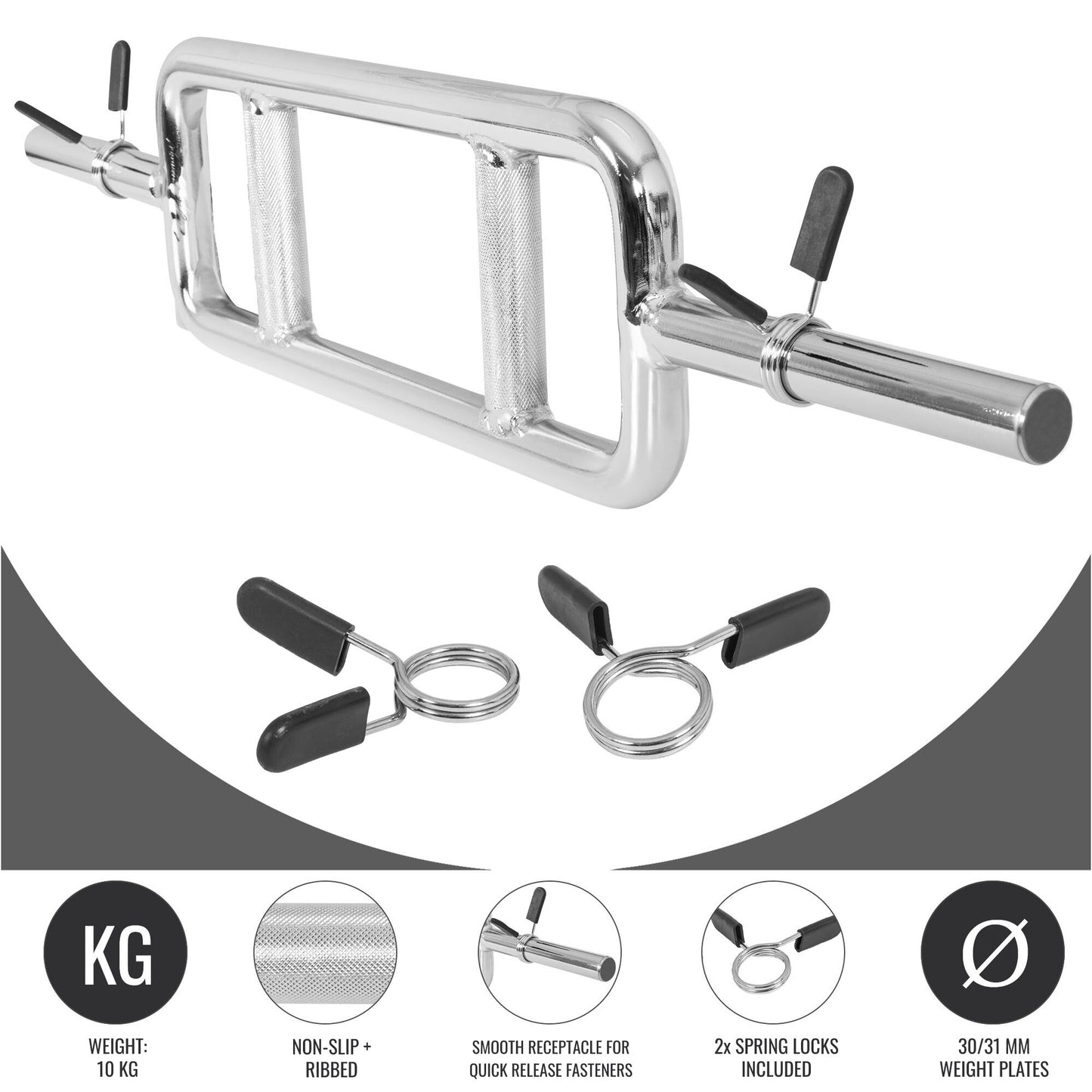 The tricep trainer bar with spinlock collars or spring collar clips from Gorilla Sports is the ideal piece of equipment for training your triceps in a targeted manner. Its parallel handles allow a natural hand position, which protects your joints. The maximum load capacity of the tricep trainer bar is 200 kg.