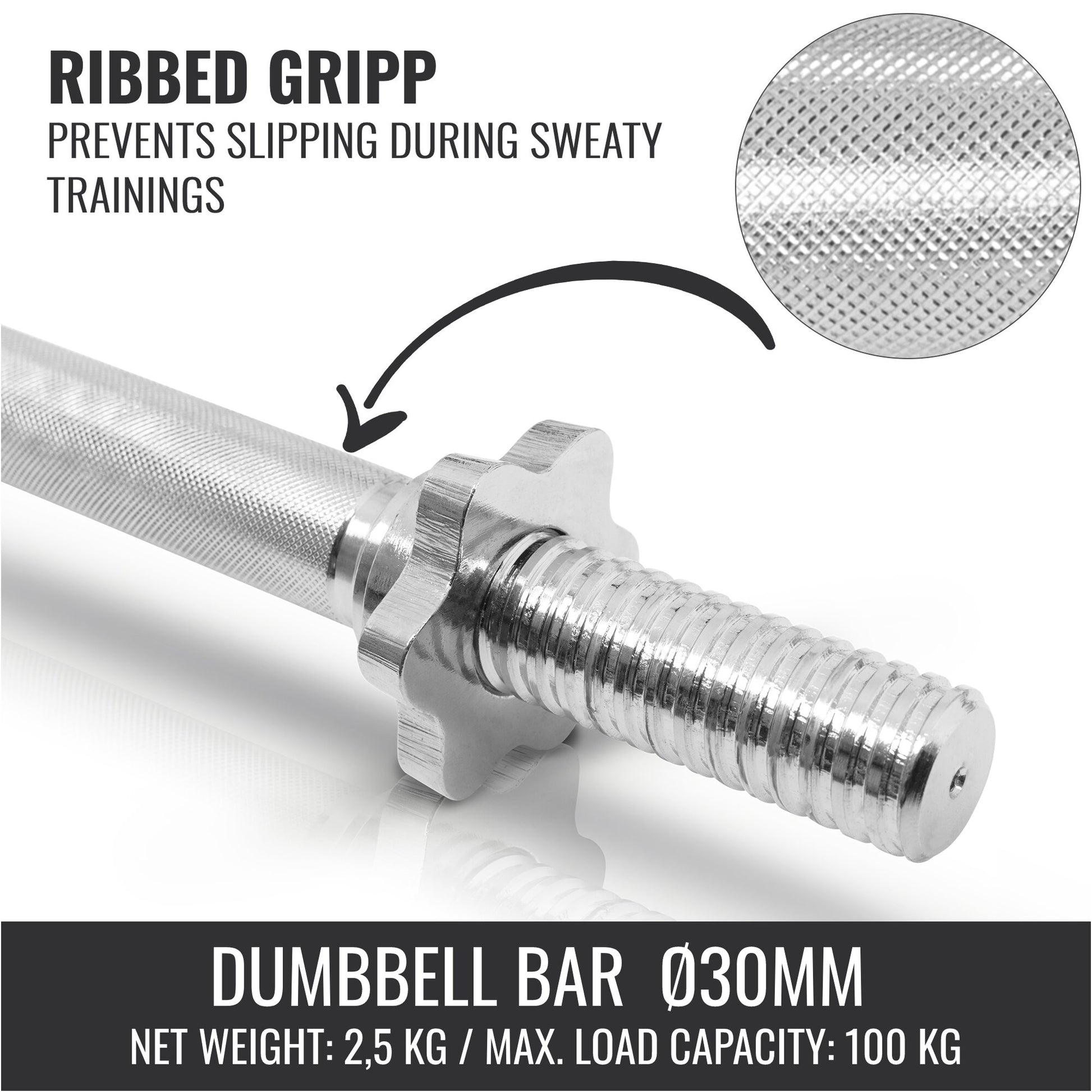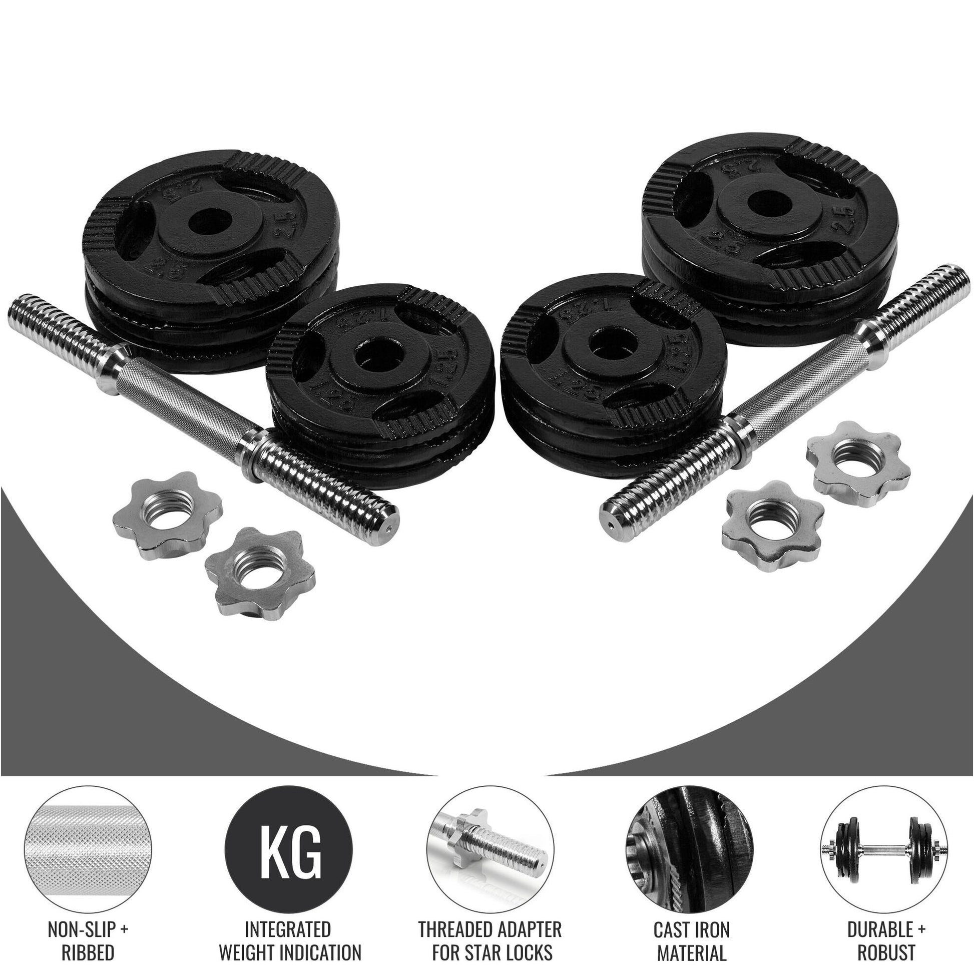 Variable dumbbell training with 12 weight plates, 2 dumbbell bars, and 4 star locks. The dumbbell set Gripper includes a total of 27.5 kg, thus offering various possibilities for placing weights on the bar. The Gripper discs are available in the set either in plain black or in gold colors.